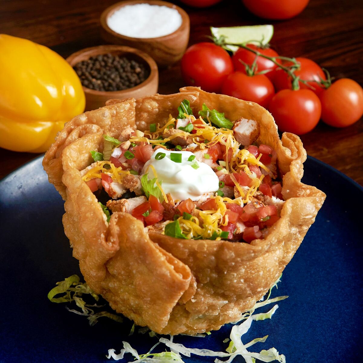 Fresh crunchy romaine and iceberg lettuce in a homemade edible salad bowl with Pico de Gallo, black beans, Cheddar cheese, and Sour Cream.