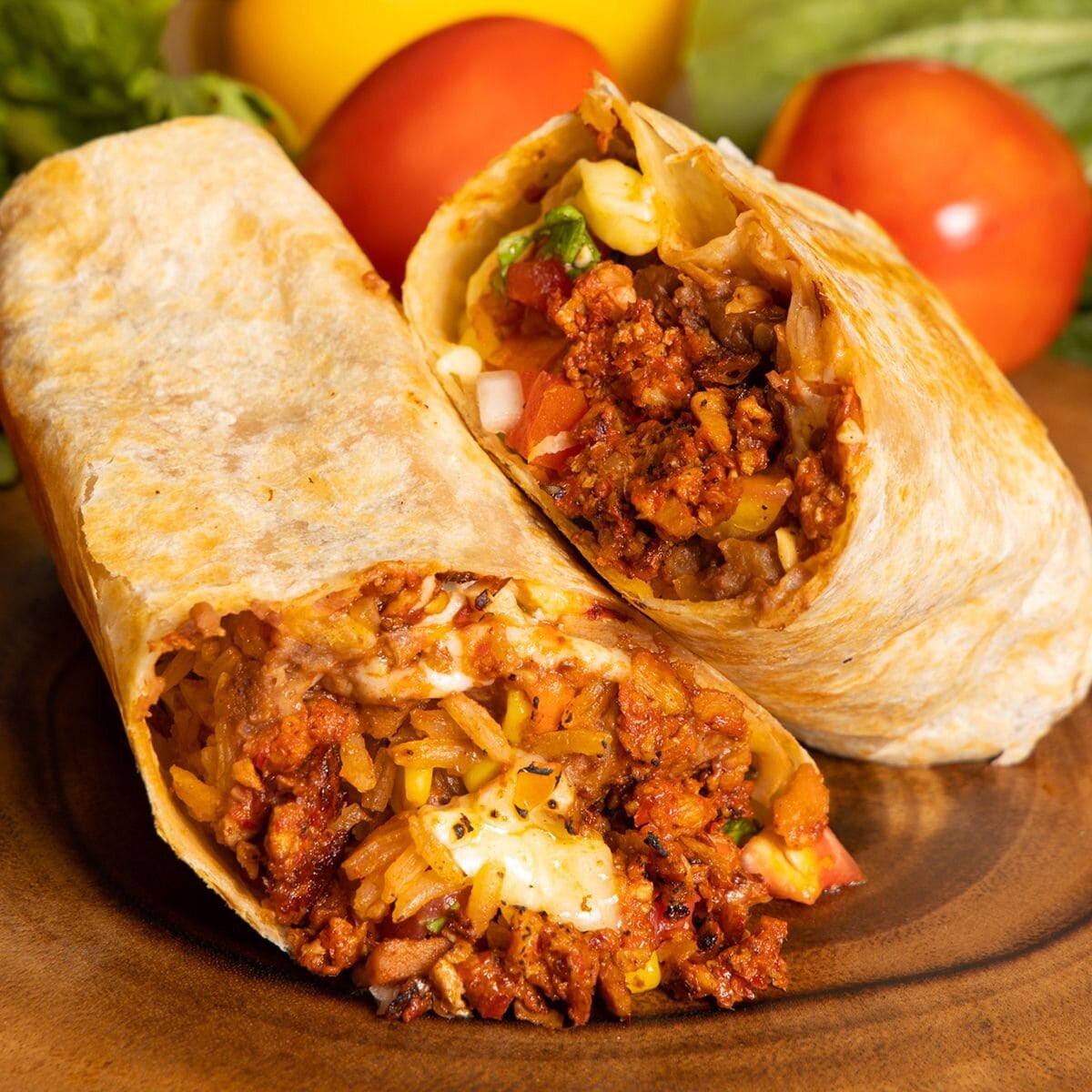Seasoned plant-based OmniMeat, SWEEST organic soy-based artisan cheddar cheese, Mexican rice, lettuce, refried beans, and roasted chipotle salsa. Choose one of your side dishes:Small salad and Ranch Dressing,Homemade Chips and Sunrise Salsa,Mexican rice and beans